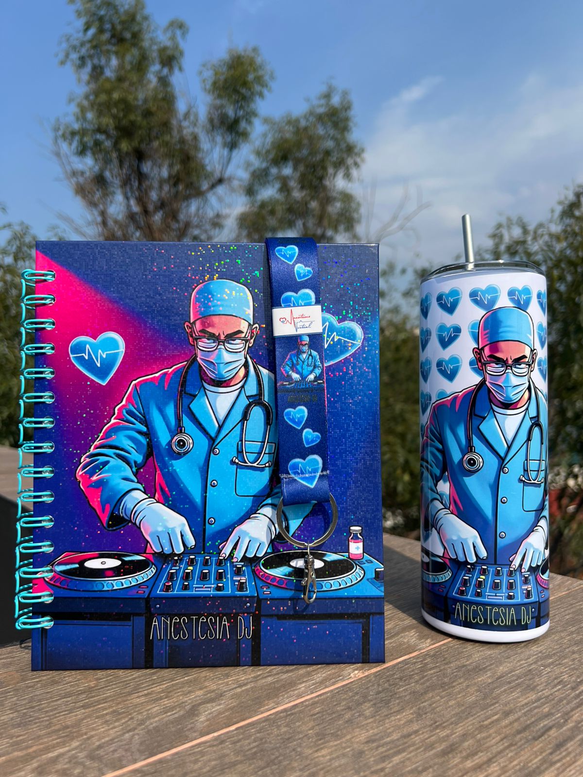 -Libreta de 18cm x 22cm, 100 hojas raya, espiral metálico, pasta dura con diseño en laminado pixel (brillante tipo holograma tanto en portada y contraportada), el el interior contiene 2 hojas con pestañas tipo sobre, calendario 2026, un apartado de stickers de anestesia.